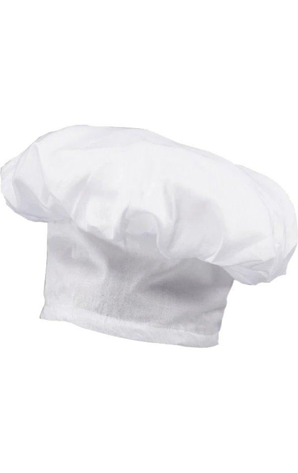 Our white chef hat has a wide hat band and a big puffed section on top. This is a one-size item designed to fit most adults. Not intended for use in play by children under 14 years of age.