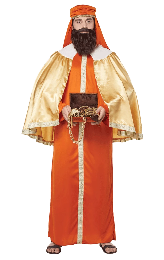 The Men’s Gaspar Three Wise Men Costume is made up of an orange robe that’s trimmed with gold. It features a matching turban, as well as a gold cape with intricate detailing. You’ll look the part, all ready for your trip to Bethlehem.