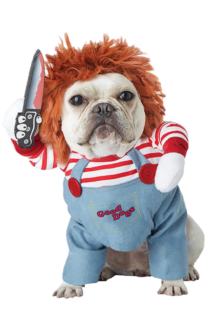Transform your dog into this iconic horror movie character this Halloween in the Chucky Dog Costume!