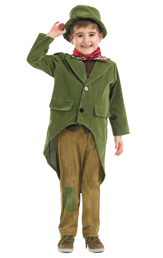 The Childrens Dickensian Boy Costume comes complete with a green jacket with a button front fastening and an attached waistcoat underneath. The outfit also includes a pair of brown trousers with a green patch on the right leg. To finish off the ultimate Dickensian Boy look, it also comes with an olive-colour bucket hat.