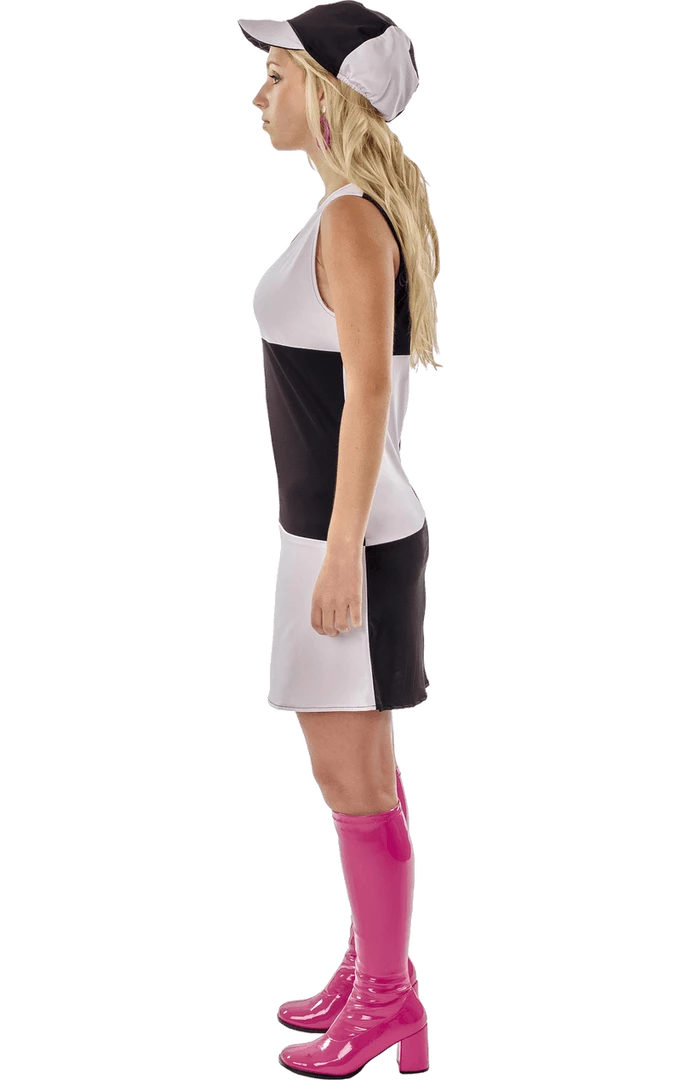 The 60s Monochrome GoGo Costume is made up of a bold and glam monochrome chequered dress. It features a matching hat and is big on swinging 60’s style!