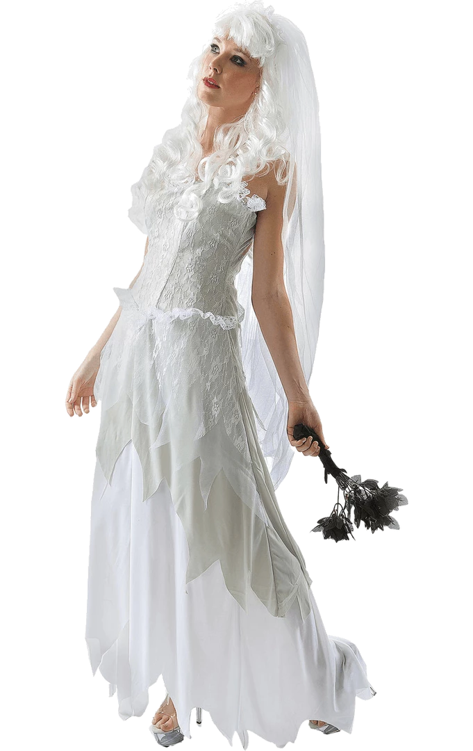 The Adult Ghoulish Ghost Bride Costume is made up of floor-length white dress with a corset-style lace top, and flowing skirt with a jagged bottom. Completing your bridal look is a long veil, which adds to your elegant ghostly beauty. You have everything you need to haunt those around you on October 31st!
