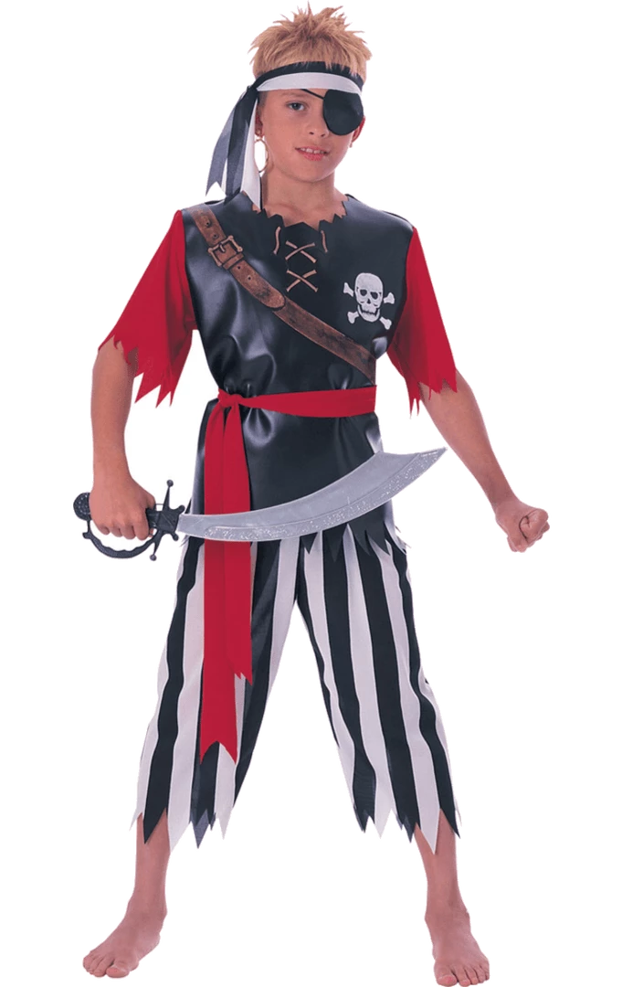 Our Childrens Pirate King Costume is made up of a black polyester top with jagged red sleeves to give it that pirate look, along with black and white striped trousers.