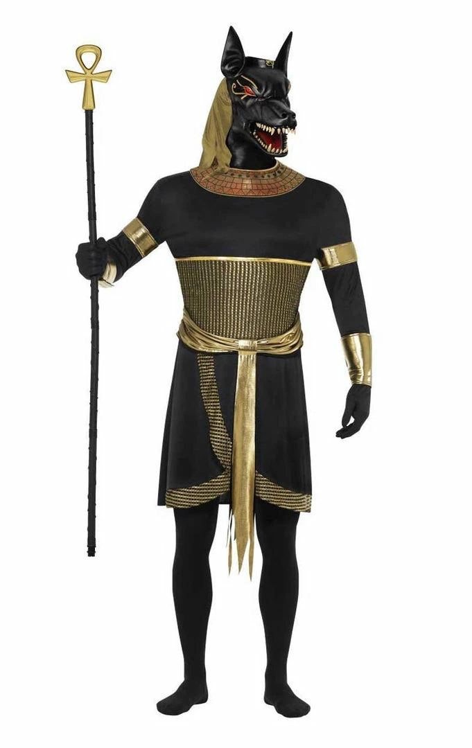 Dress up as one of the most iconic Egyptian Gods of all time with our Anubis the Jackal costume. Complete with a long tunic, facepiece, gold collar and 4 arm cuffs.