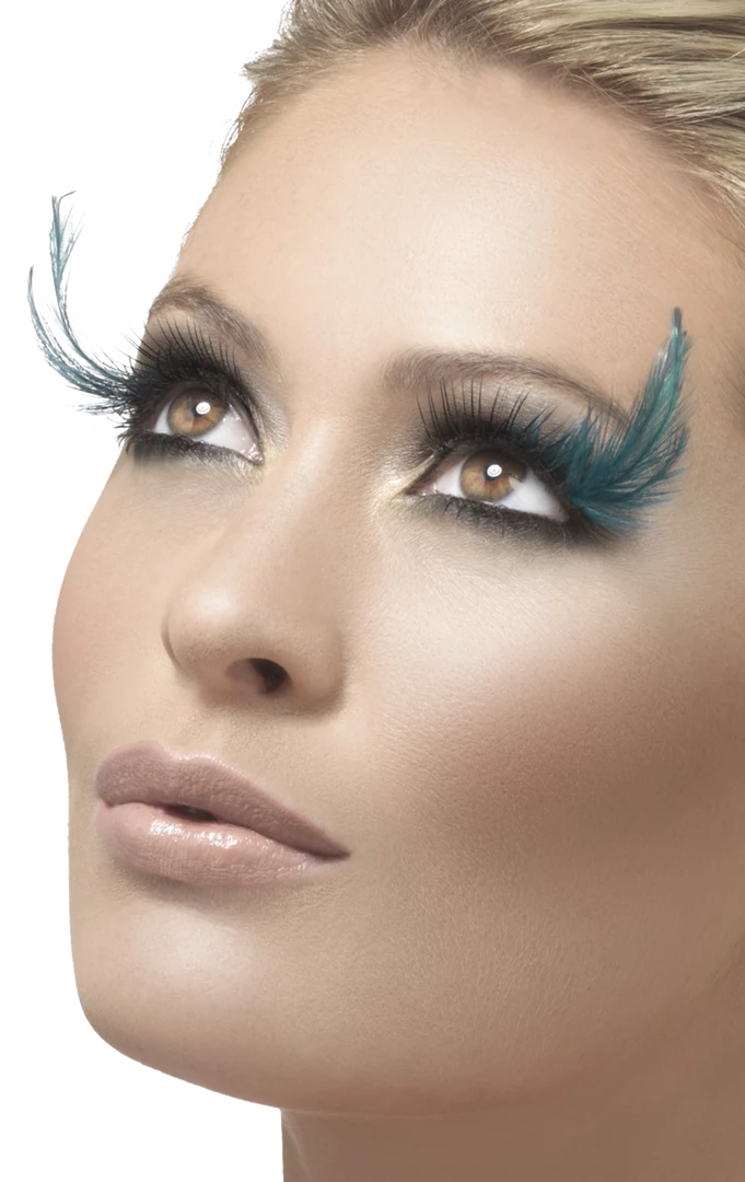 These lashes are black with and an array of teal feathers added to the outside corner on both set of lashes. Adhesive is included. Please note make up and other accessories are available separately.