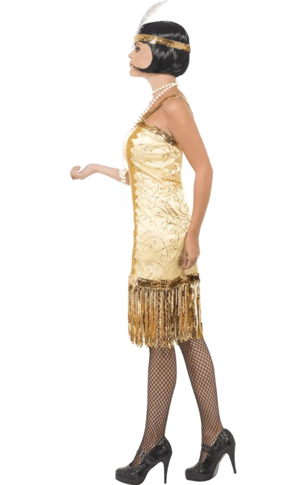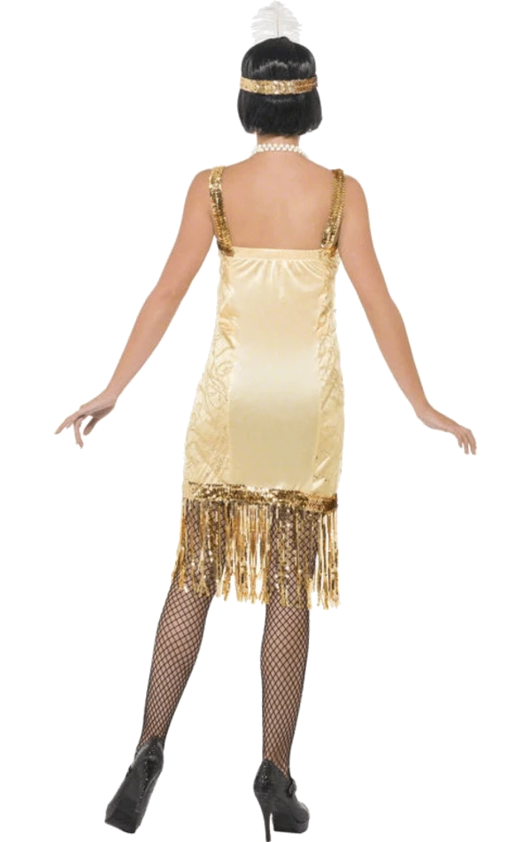 Wow, you’re one glitzy goddess in this breathtaking Gatsby number! Steal the show as you strut your stuff to the 1920s Chaleston beat in this foxy, flirty, golden flapper costume. With your sassy tassles and striking white feathered headband, you’ll be sure to captivate that gangster mafia boss in no time. You’re a moll who refuses to be outshone!