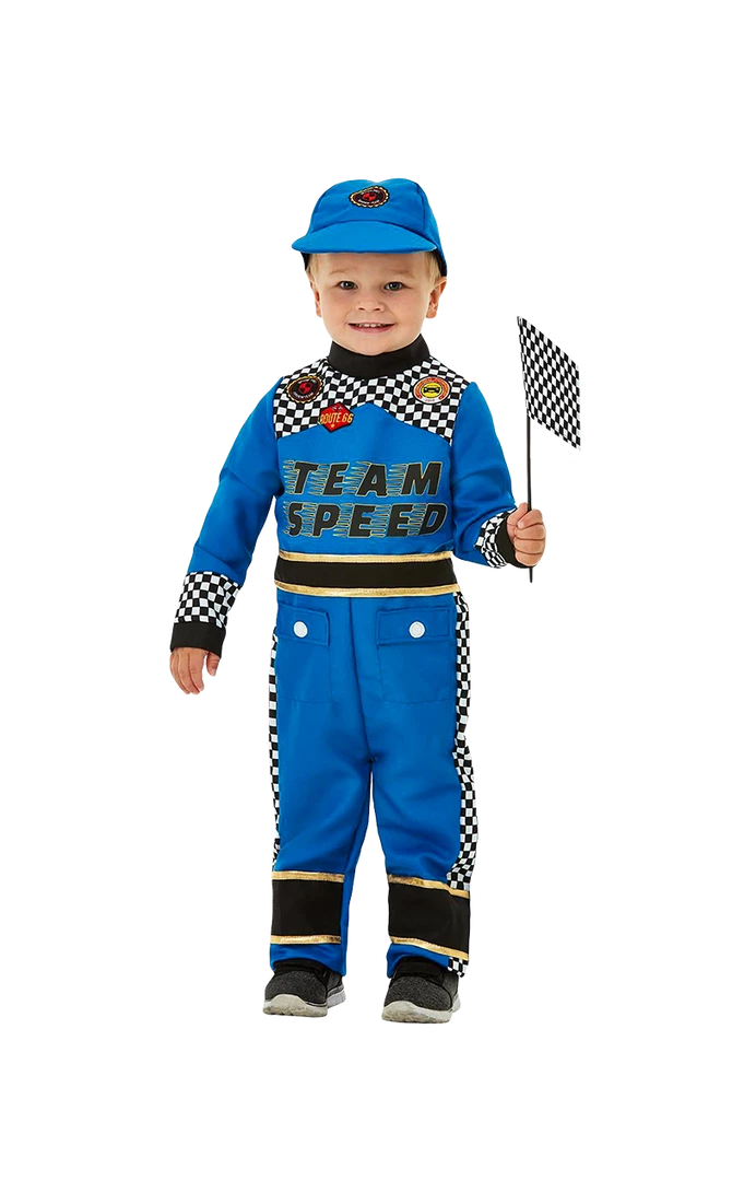 Let your little speed junkie race around the party in this Kids Race Car Drive Costume. Let him imagine that he’s an F1 Driver and wave the session flag with a victorious smile! This little blue racing driver costume comes complete with a Team Speed jumpsuit, cap and flag… 3,2,1…GO!