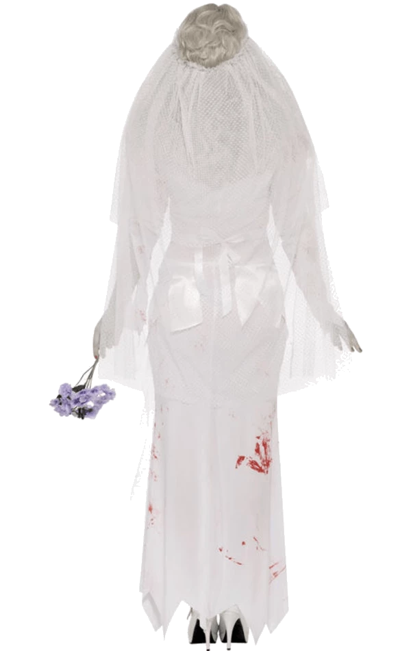The Dead Bride Halloween Costume features a long, white dress with jagged edges. It also includes a netted veil to surprise your past lover when you say your vows, plus a bouquet of lilac flowers.