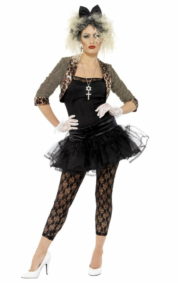 The Womens 80s Wild Child Costume is made up of a black top with a matching black tutu and a pair of black lace-material leggings. Completing the look is a short jacket with glitter sleeves and a gold leopard print trim, as well as a sexy pair of white lace gloves and a black bow headband.