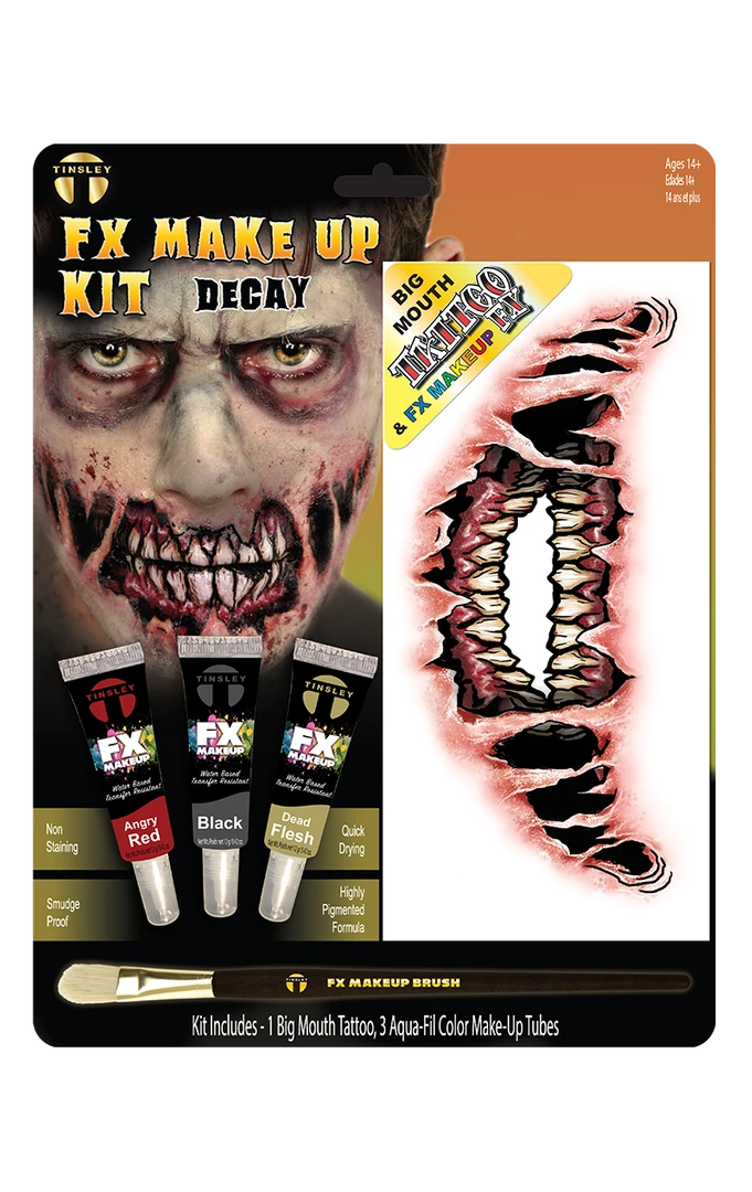 If you want your Halloween look to be a breeze, buy the Zombie Makeup Kit! It’s got all you need for that gory time of year! Includes: Paints in Angry Red, Black and Dead Flesh. One Big Mouth Tattoo and one brush. Suitable for 14 years +