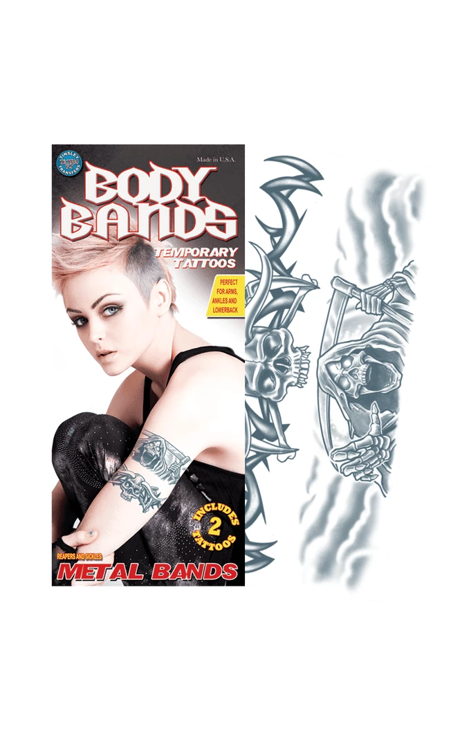 Dressing up in a creepy and ghoulish way in Halloween doesn’t always mean chasing people around the dance floor into an early grave with your scythe! Channel more of a gothic rock look with these Reaper Body Band Tattoos, and believe us, they’ll make you look deathly cool!